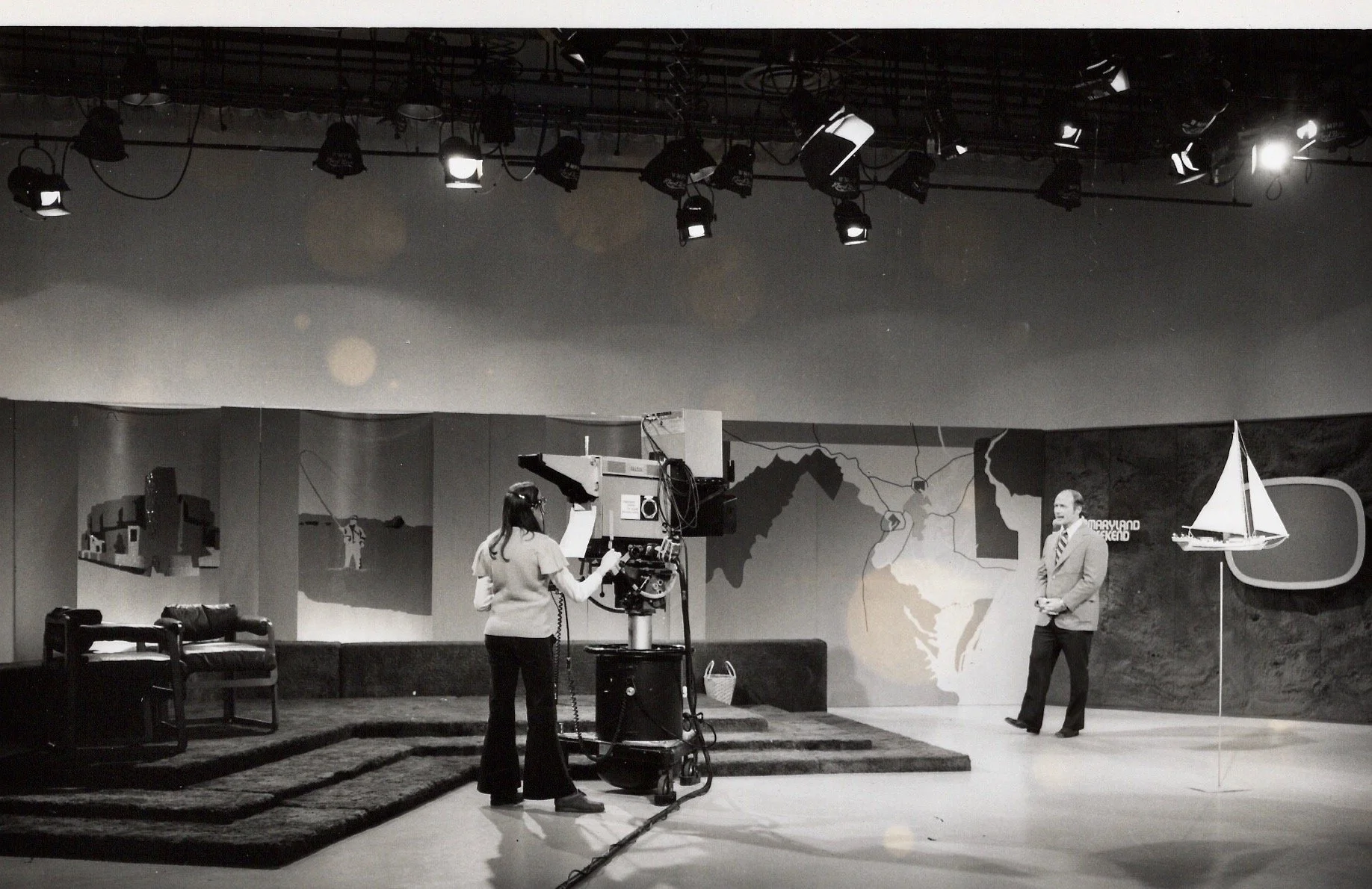 Running camera with host Bob Callahan on the set of Maryland Weekend. Notice the small tv on top of the lens. That was our teleprompter then. (photo courtesy MPT)